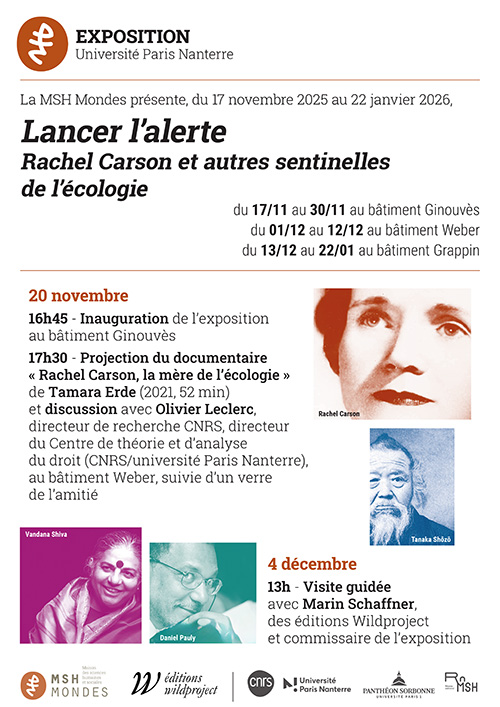 La MSH Mondes organise l’exposition « Lancer l’alerte. Rachel Carson et autres sentinelles de l’écologie » afin de sensibiliser la communauté universitaire au rôle des lanceurs d’alerte sur les sujets du changement climatique, de l’effondrement de la biodiversité et du dépassement des limites planétaires.