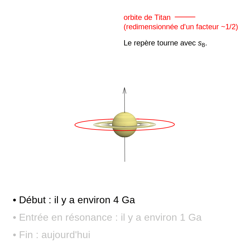 Ces résultats remettent en question le scénario établi jusqu’alors. Les astronomes s’accordaient déjà sur l’existence de cette résonance mais ils pensaient qu’elle s’était produite très tôt, il y a plus de quatre milliards d’années, en raison d’une modification dans l’orbite de Neptune. Depuis lors, on pensait l’axe de Saturne stabilisé. En réalité, l’axe de Saturne bascule toujours, et nous n’observons aujourd'hui qu'une étape transitoire de cette évolution. Dans les prochains milliards d'année, l'inclinaison de l'axe de Saturne pourrait plus que doubler.